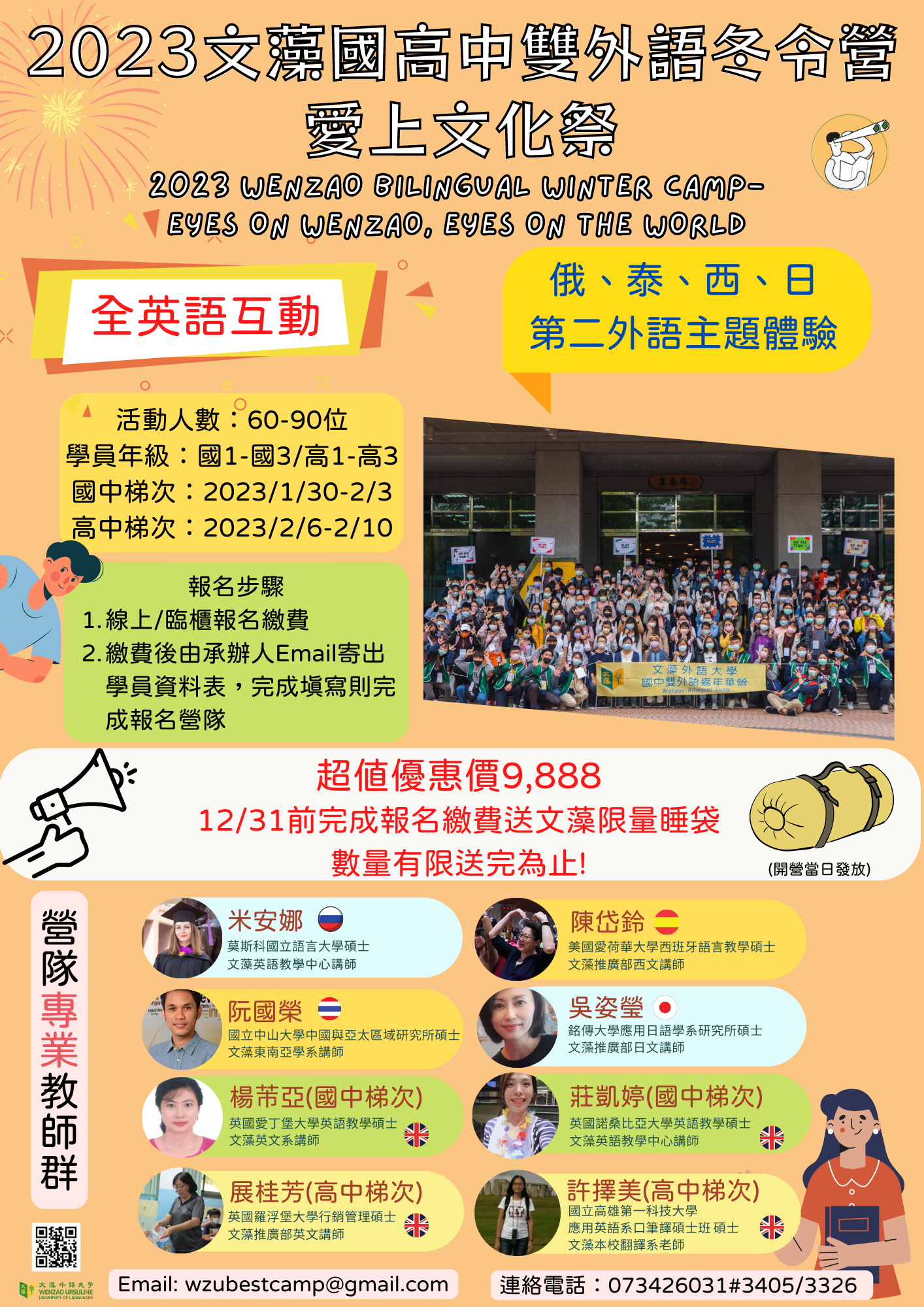 | 三、 | 活動對象:國中學生(採全英語教學與活動進行,報名時請檢附 111 學年度成績單英文 70 分以上或全民英檢初級初試通過證明)。 |