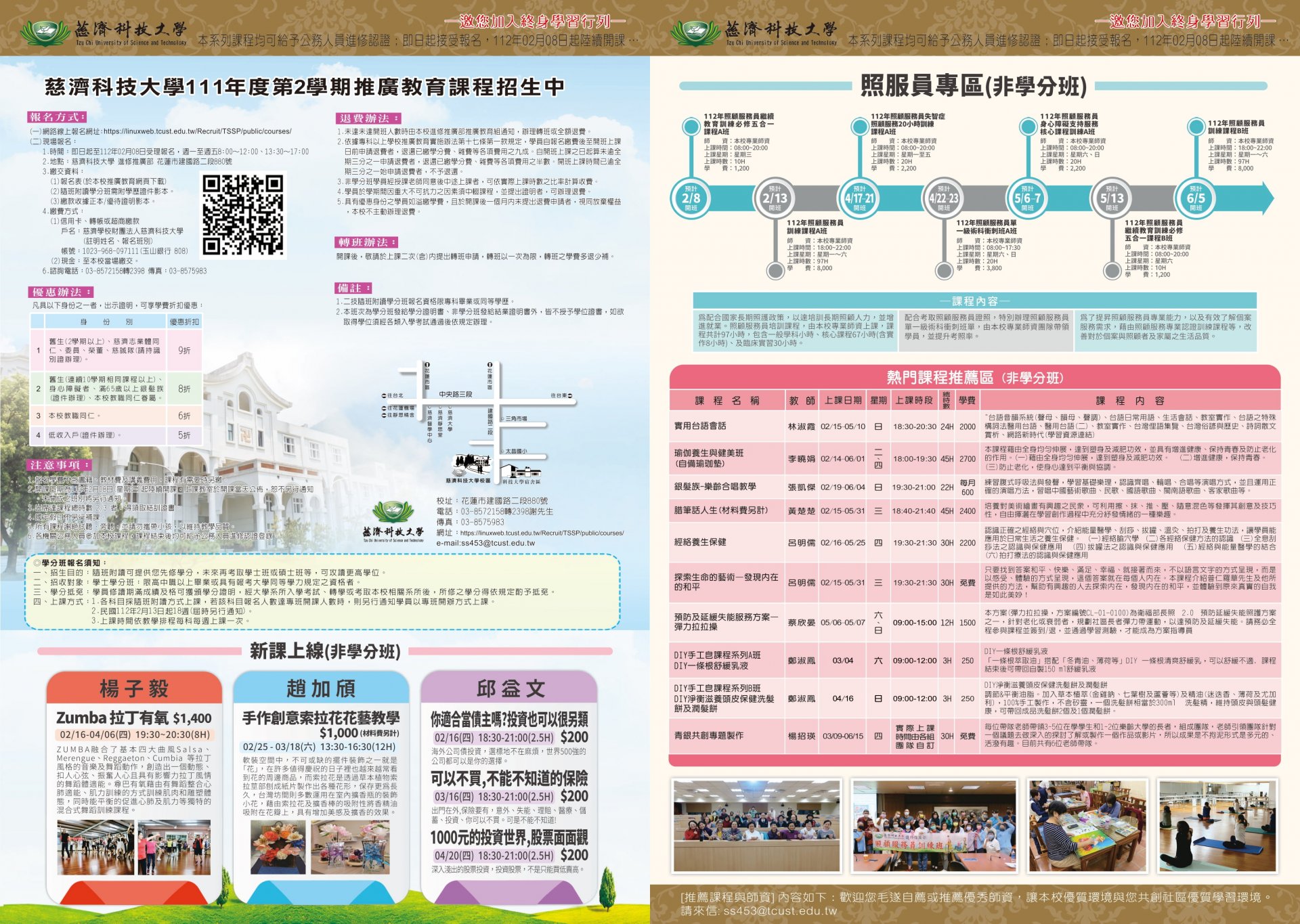 慈濟科技大學111學年度第2學期推廣教育課程簡章及報名表各1份。